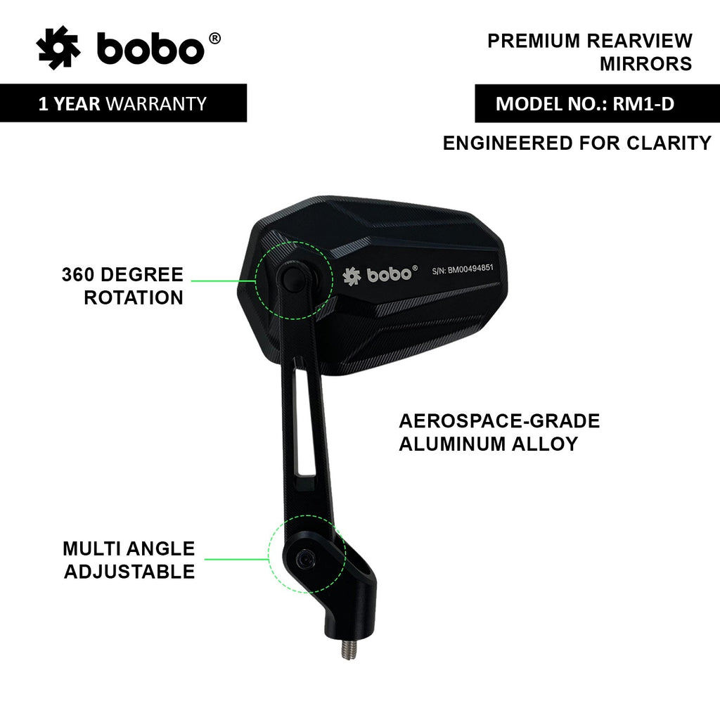 The BOBO RM1 D Mirror is a high-quality aftermarket motorcycle mirror designed to deliver crystal-clear visibility, long-lasting durability, and stylish aesthetics. Whether you are commuting daily or heading out on long rides, the RM1 D ensures a wide field of vision with reduced blind spots, helping you ride with confidence and safety.