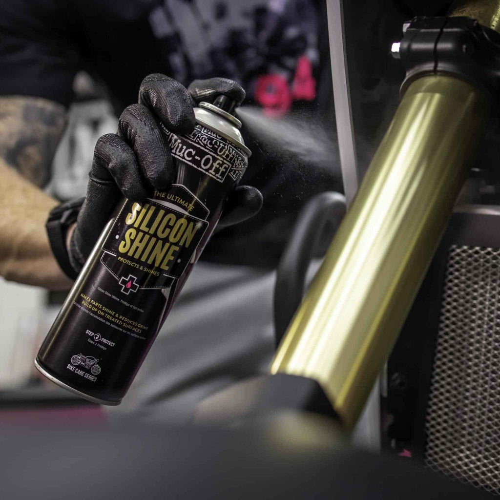 Muc-Off’s Silicon Shine not only leaves your motorcycle looking factory fresh, but it also helps reduce dirt adhesion keeping your bike cleaner for longer. Simply spray it under your mudguards to prevent mud from sticking and make your next wash easier.