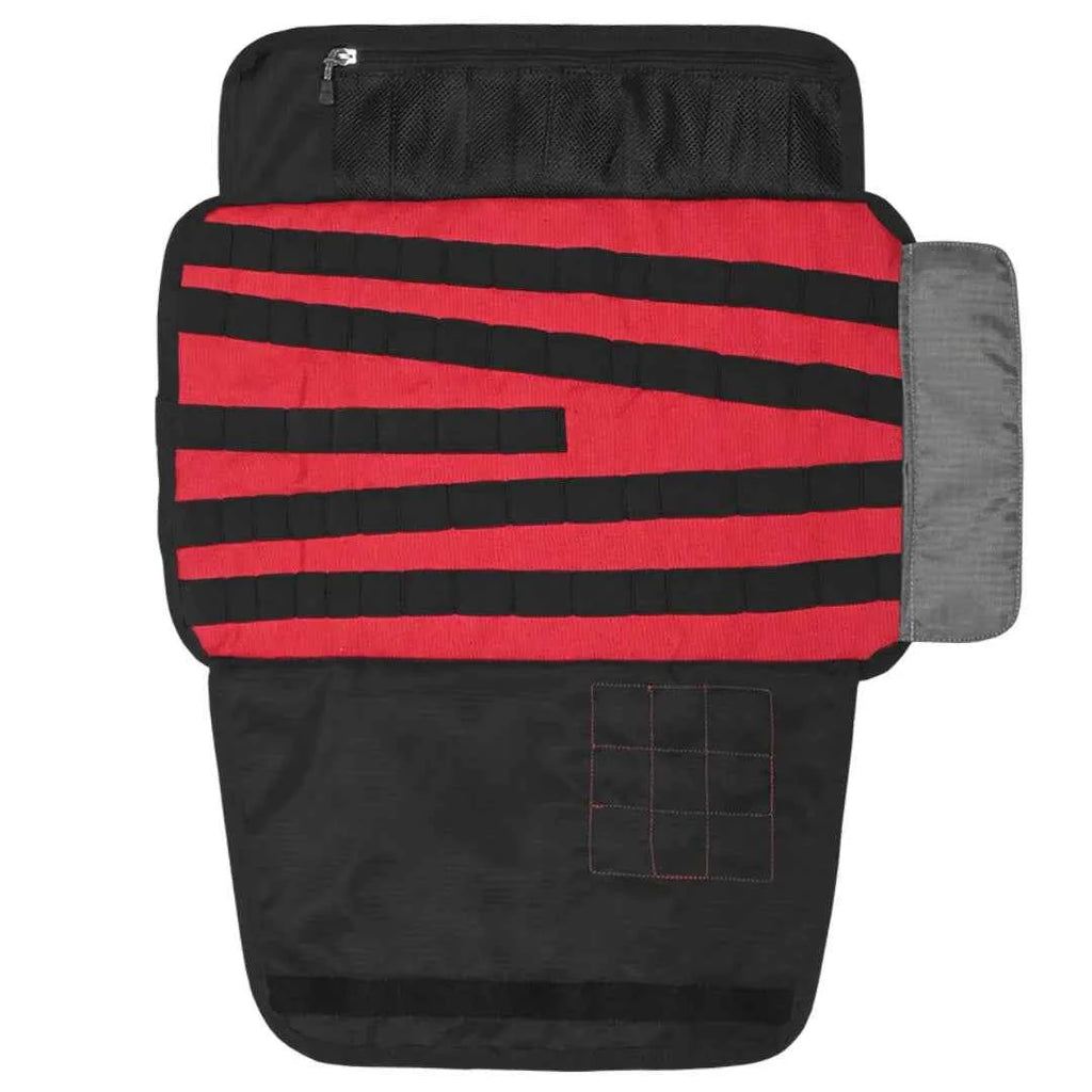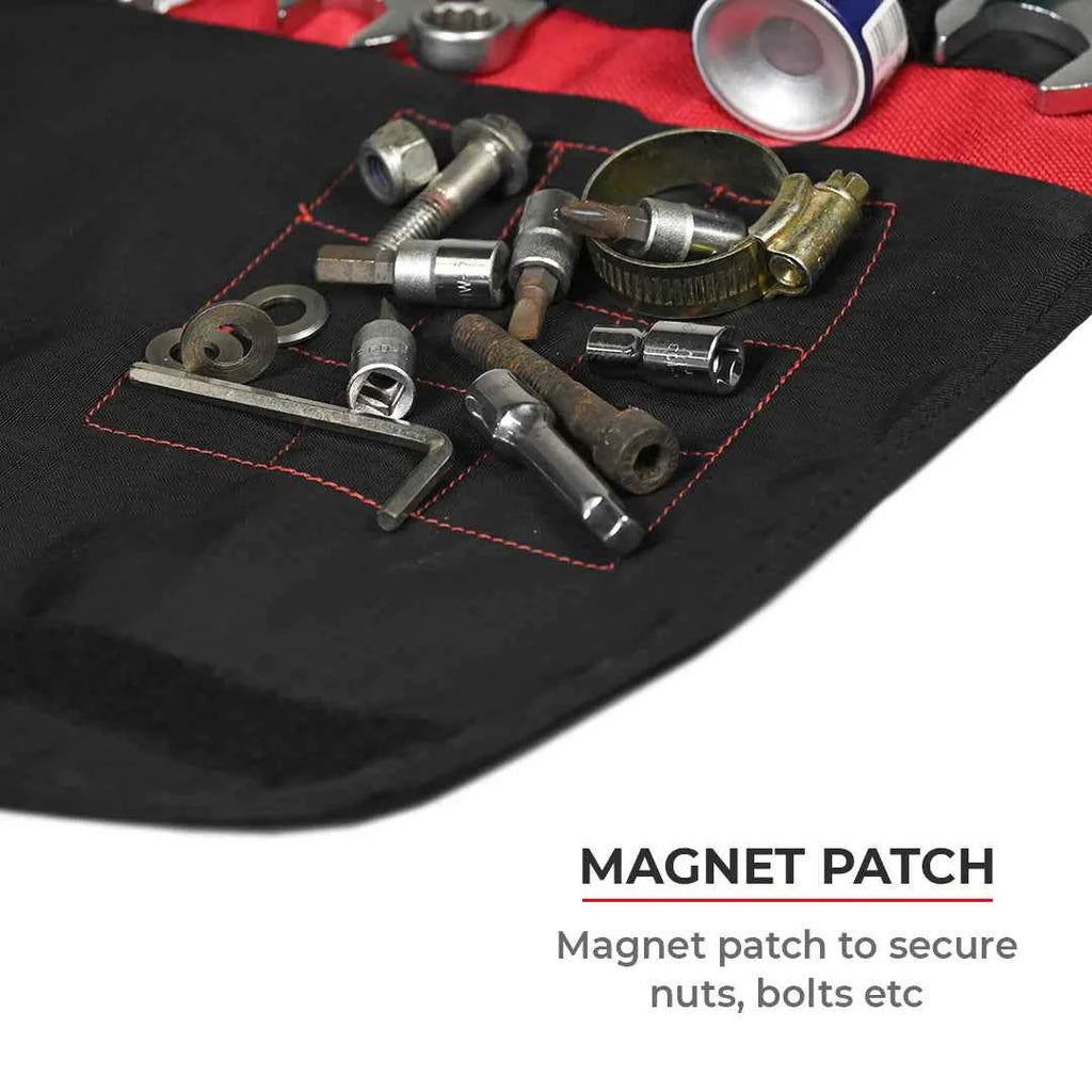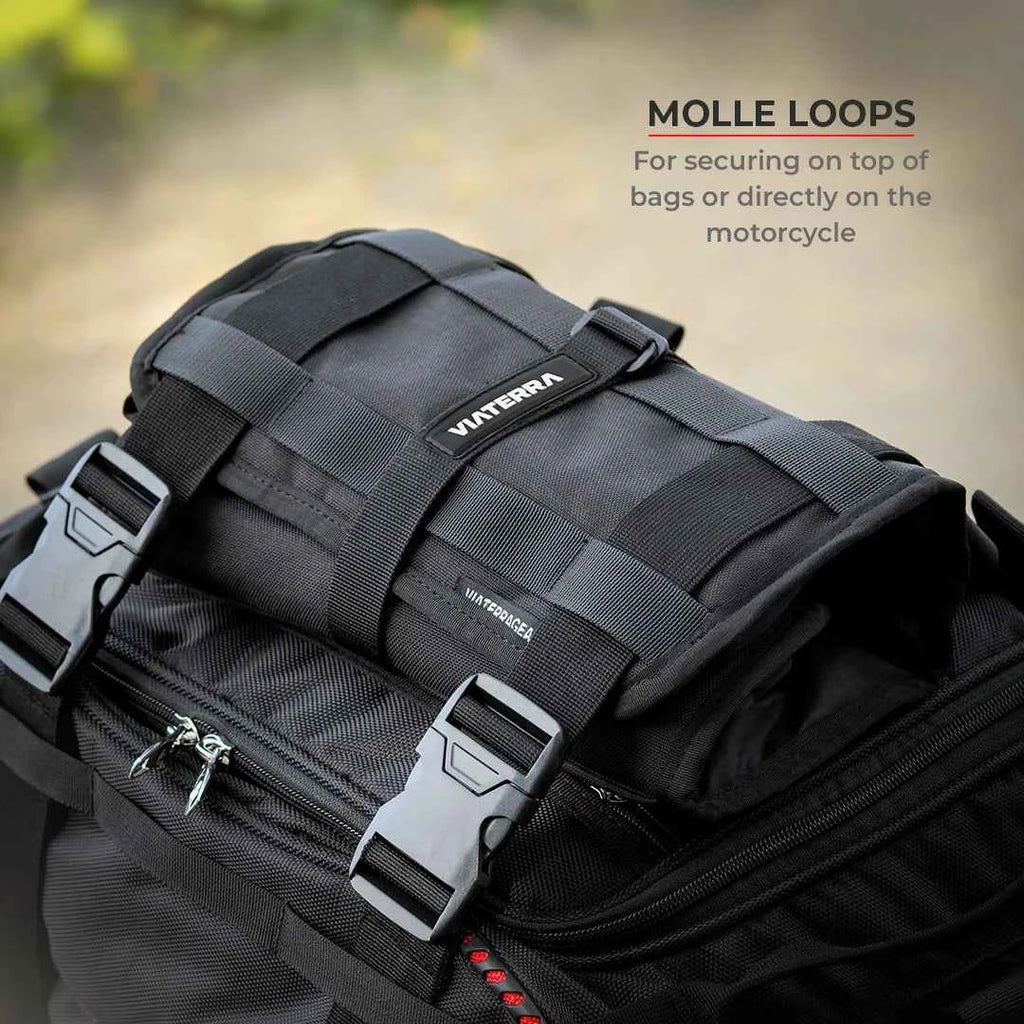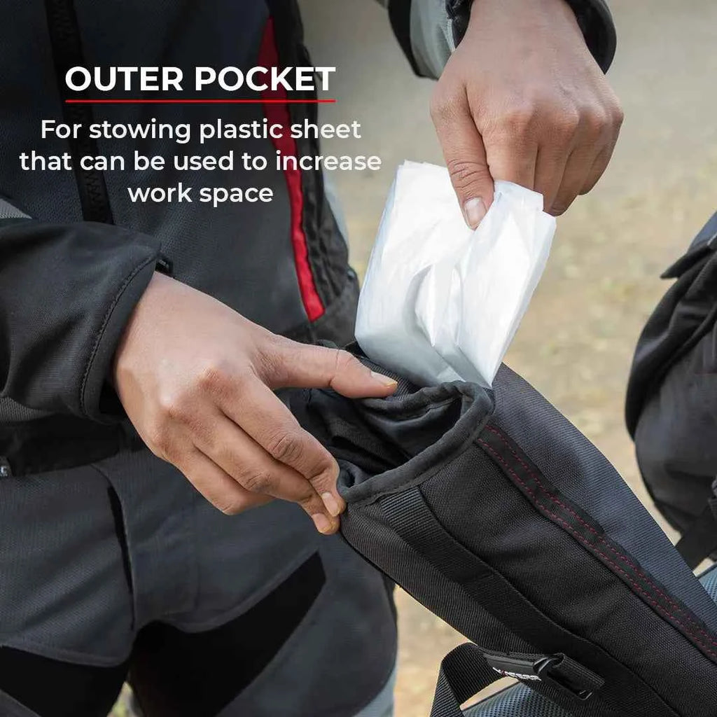 The Tool Pack Pro is designed to keep your tools organized, accessible, and ready for quick roadside fixes. It mounts securely on the outside of your luggage, saving valuable storage space while keeping dirt and grease away from your main gear. With a spacious fold-out workspace, multiple compartments, and a magnetic patch to hold nuts, bolts, and small parts, it makes maintenance on the go effortless. An external pouch lets you carry a plastic mat for bigger jobs, while MOLLE loops provide versatile external mounting options.